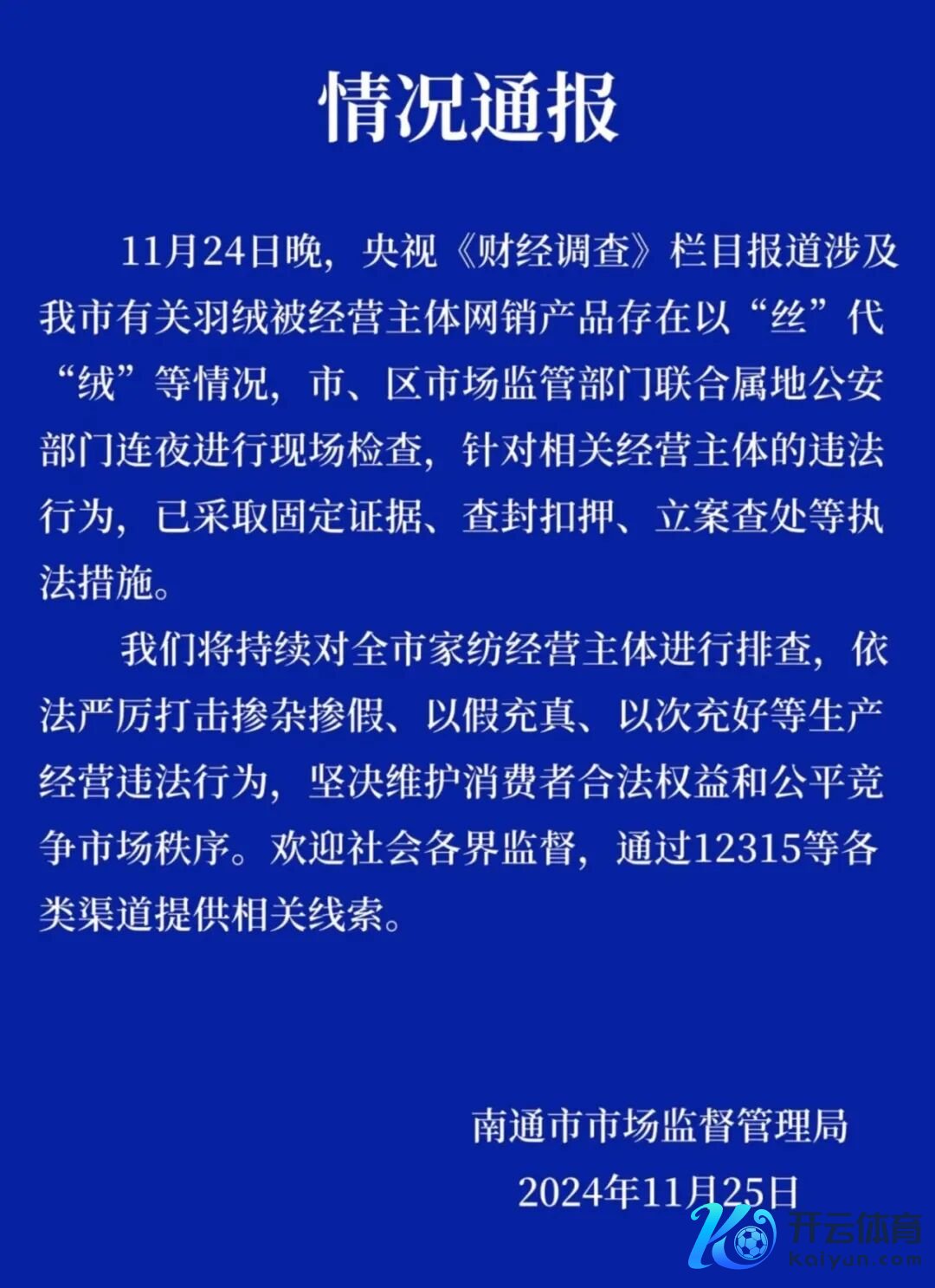 本日(11月25日),南通市阛阓监管局发布情况通报,针对关连策画主体羽绒产物“以丝代绒”、标签吊牌作秀等不法活动,已连合属地公安部门进行现场查验,遴选固定把柄、查封扣押、立案查处等王法措施。