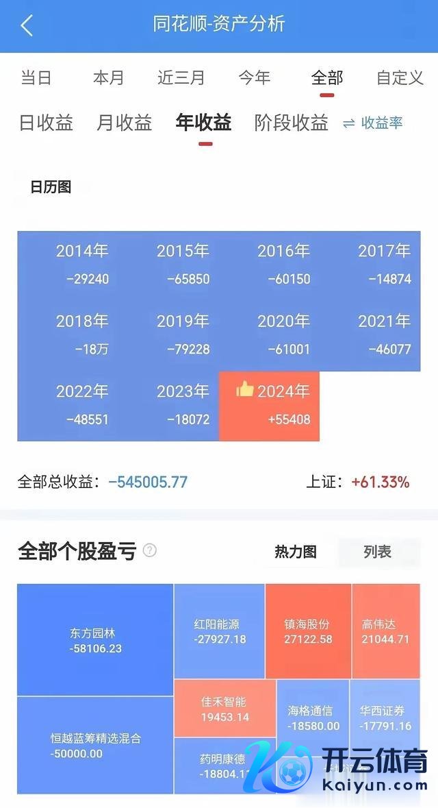 不外最近有位股民终于比及了花开日出,2014年入市炒股的他,自从捧着钱插足股市的那一刻起,就没赚过钱,一年接一年下来,整整熬过了10个岁首,莫得一年是赢利盈利的,最少的2017年失掉了超1.48万元,2018年更是巨亏18万元。闲来无事帮他算了一下,从2014年至2023年区间累计失掉60.3万元,不得不佩服他的相识,诚然不知说念他是若何熬过来的,但能那么多年这么的坚握下来,对大A股是不离不弃,我合计这应该便是真爱了吧。