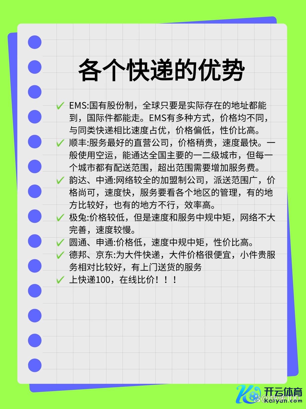 寄快递小tips:1、轻的走快递九游体育app官网,重的走物流2、南边寄朔方:圆通3、朔方寄南边:中通4、广东寄东北:申通5、文献、发票、契约类:顺丰、EMS6、偏远:中国邮政7、冷链生鲜:顺丰、京东