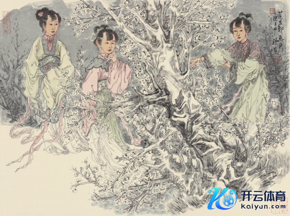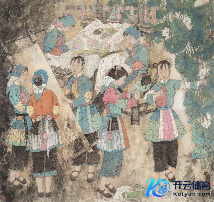 照旧有代表性的工笔画作,如墨彩《苏绣》,致密雅丽、色墨和会。石青、石绿与胭脂、朱砂等未几的容貌构建起极具江南诗性的颜色体系,融汇丰富的墨色左右,造成了彩和墨丰富的档次感和肌理感。策展东谈主孙俊对此有一番解读甚是到位:画面中不仅有水墨与留白、容貌的冷与暖的韵律对比。还有线的松与密,连绵的长线和狭小的短线节拍对比,并跟着格调的演进也在连续地发展和跟递,最终造成了他独到的双勾顿线,说是顿线,其实是他勾线时笔触很慢,有一种抑扬感,和他的造型话语造成了形式上的呼应,完善了他画面的朴拙气质。