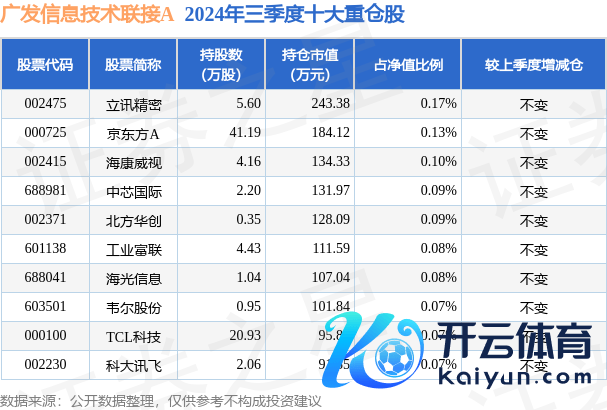 广发信息技艺聚会A为指数型-股票基金,凭据最新一期基金季报闪现,该基金财富设立:股票占净值比3.22%,债券占净值比0.97%,现款占净值比4.2%。基金十大重仓股如下: