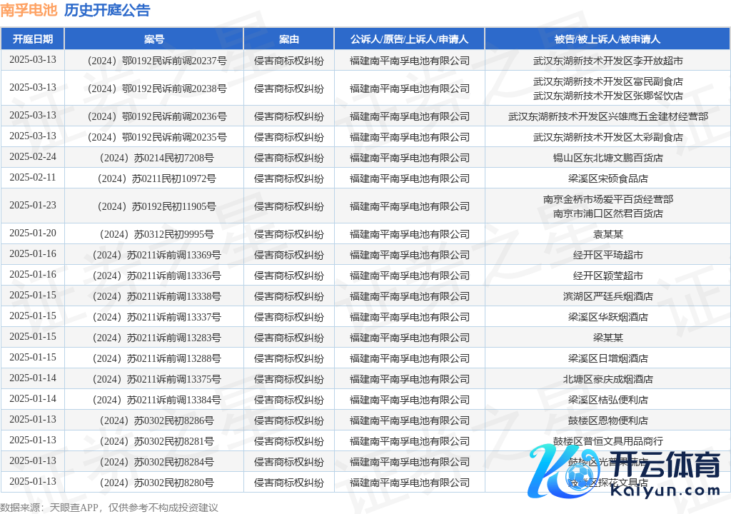 本站音讯,字据天眼查APP涌现,近日公布了一则福建南平南孚电板有限公司看成原告/上诉东谈主的开庭公告,注重试验如下: