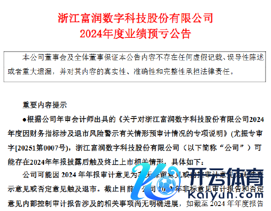 1月24日晚,浙江富润数字科技股份有限公司发布2024年度事迹预亏公告,瞻望净利润将处于-38500万元至-31500万元之间。公司造就推动,公司股票存在退市风险,若审计效果不良,将可能导致股票在2024年袒露后间隔上市。